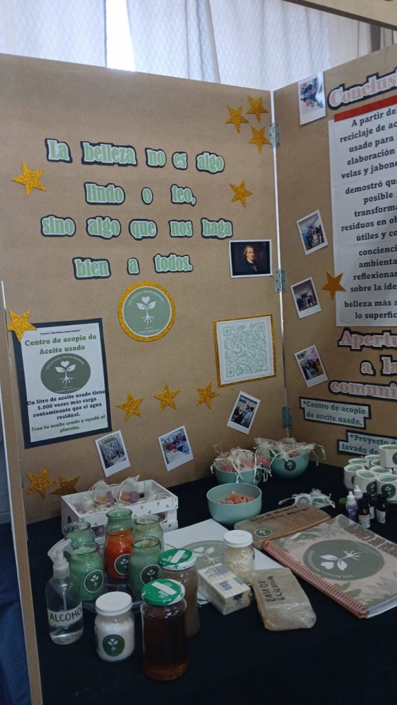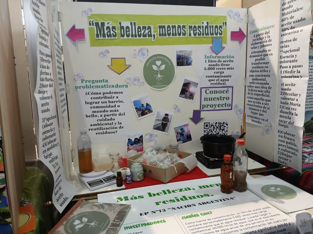 Nos sentimos muy apoyados por las familias, porque el proyecto era de todxs. Son cuarenta y cuatro en el aula y las familias lxs apoyaron. Mandaban las botellas con aceite para crear jabones, juntaron y compraron los materiales para hacer velas en su casa. En las reuniones de padres les entregamos jabones para que se lleven, también repartimos en los actos escolares. Las familias estaban muy involucradas y muy contentas por lo que estábamos haciendo. La verdad que es un trabajo muy grande, es mucho lo que una tiene que hacer, pero si lo ves desde diferentes enfoques, podés estar toda la jornada trabajando en esto y lo van a ver desde todas las materias. Tuvimos una mirada en lo social, mirando cuáles eran las problemáticas ambientales; vimos desde Naturales las mezclas; desde matemática las estadísticas que surgían de las encuestas, y como nuestro proyecto se llama “Más belleza, menos residuos” vimos, desde ESI, el concepto de belleza. Nos pusimos a debatir sobre qué era la belleza para nosotrxs. Y nuestro lema terminó siendo: “que es algo que nos hará bien a todxs en comunidad”. No pensar la belleza desde el lado superficial, sino pensarla como un bien común. Sí, es un trabajo arduo, pero es un trabajo que a lxs nenxs les queda. El día de mañana, esa sensibilidad hacia lo comunitario, hacia los problemas que pueden surgir, van a ayudar para mejorar la vida cotidiana.