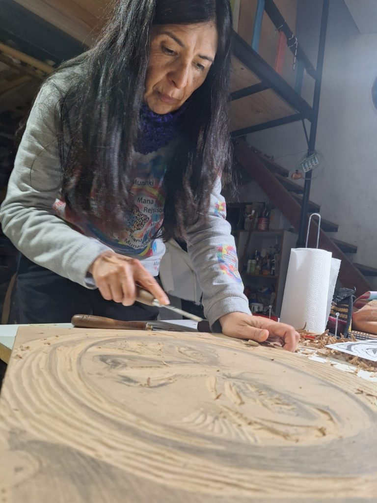 Natalia: Nosotrxs hacemos grabado en relieve; necesitamos rodillos, tintas, una prensa. Tradicionalmente el grabado se trabajaba con cuchara de madera y ejerciendo mucha presión sobre el papel y sobre la matriz. Acá como teníamos que trabajar sobre telas, tuvimos que ver quién tenía prensa y que fuera transportable. La compañera Bernabé tiene una prensa, que es de un tamaño que se puede trasladar y se puede ubicar en una mesa, y es la que la que nos acompaña a todos lados. Tenemos que organizar quién lleva los tablones, quién lleva la mesa, quién la tinta, los papeles. Somos muchxs y hay que repartir tareas, pero todxs nos acomodamos a lo que hay que hacer. Eso está re bueno, porque trabajar en equipo implica que tenemos que estar comunicadxs todo el tiempo. Antes de llegar a un lugar tenemos que acordar todo lo que lo que hay que llevar. Las matrices generalmente las vamos haciendo cada unx en su casa. Esas matrices están cada una en un lugar distinto, tenemos algunas que son muy grandes y que en la prensa no entran, entonces según a dónde vamos -depende de la convocatoria- vemos qué matrices llevamos.