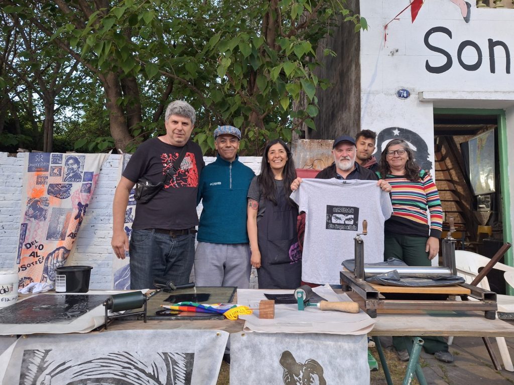 Rodrigo: En la actividad por Sandra y Rubén en Moreno había unos compañeros de la CGT de Marcos Paz que nos invitaron a una jornada sobre la memoria de los desaparecidos de esa localidad. Ahí, con unos caños de PVC, armamos como una especie de grandes arcos en donde colgamos nuestras producciones, para que se fueran secando. También empezamos a poner una alcancía y entonces la gente iba dejando algo a voluntad, como para volver a comprar tinta, papeles, telas. Luego, en una jornada que hubo acá en Luján, en un Centro Cultural nuevo, se hizo un homenaje a Mercedes Sosa. Trabajamos con esa temática, hicimos dos tacos y el grande sirvió para hacer una gran bandera para exponer; fue hacer un poco de escenografía en el lugar, porque también pensamos cómo presentamos las cosas y entonces ambientamos el espacio como parte de la colectiva. La gente que organizaba, que eran copleras, nos encargaron que le hagamos unas remeras, así que también compramos remeras para vender, tratando de buscar un precio que la gente se lleve una remera económica y con una estampa linda. Las vendimos todas y con eso vamos comprando más material.